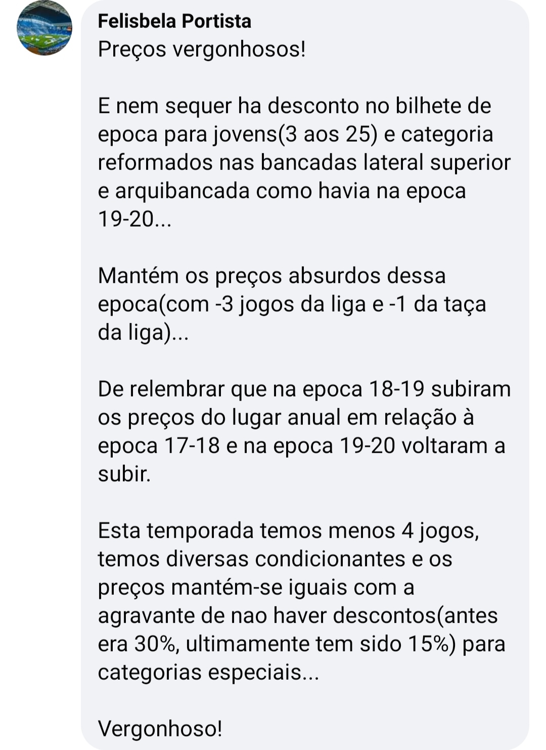 Qual a tua opinião? Partilhas desta indignação ou consideras os preços justos tendo em conta a situação pandémica que o clube atravessa e as suas necessidades de tesouraria que foram fortemente afetadas com isso?