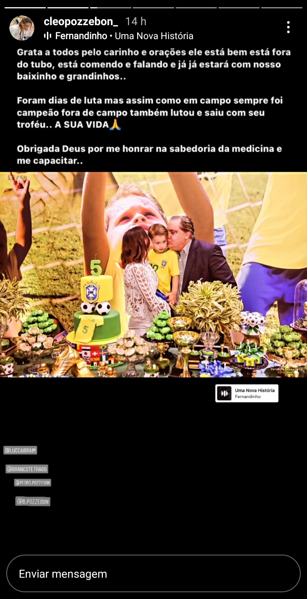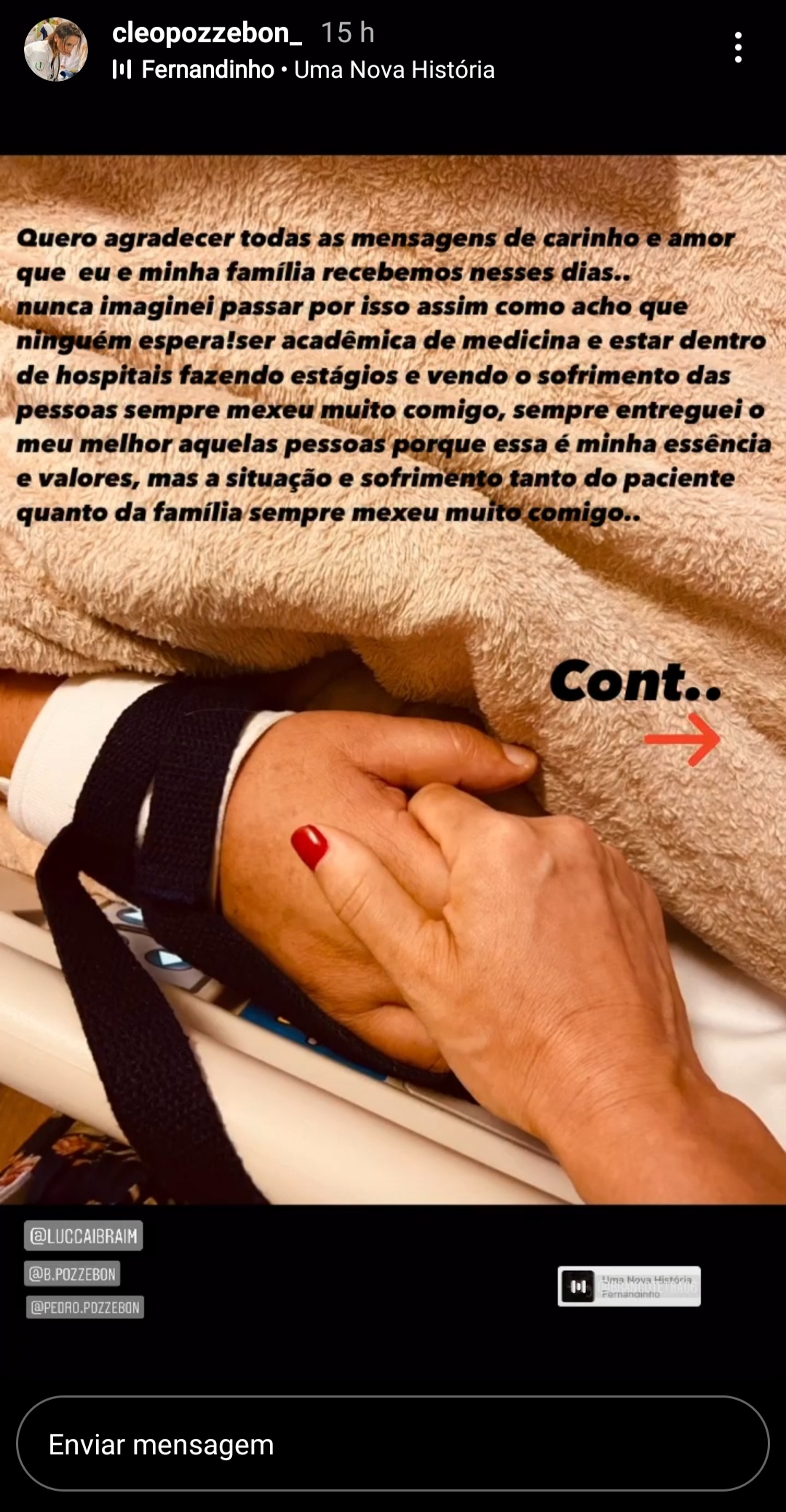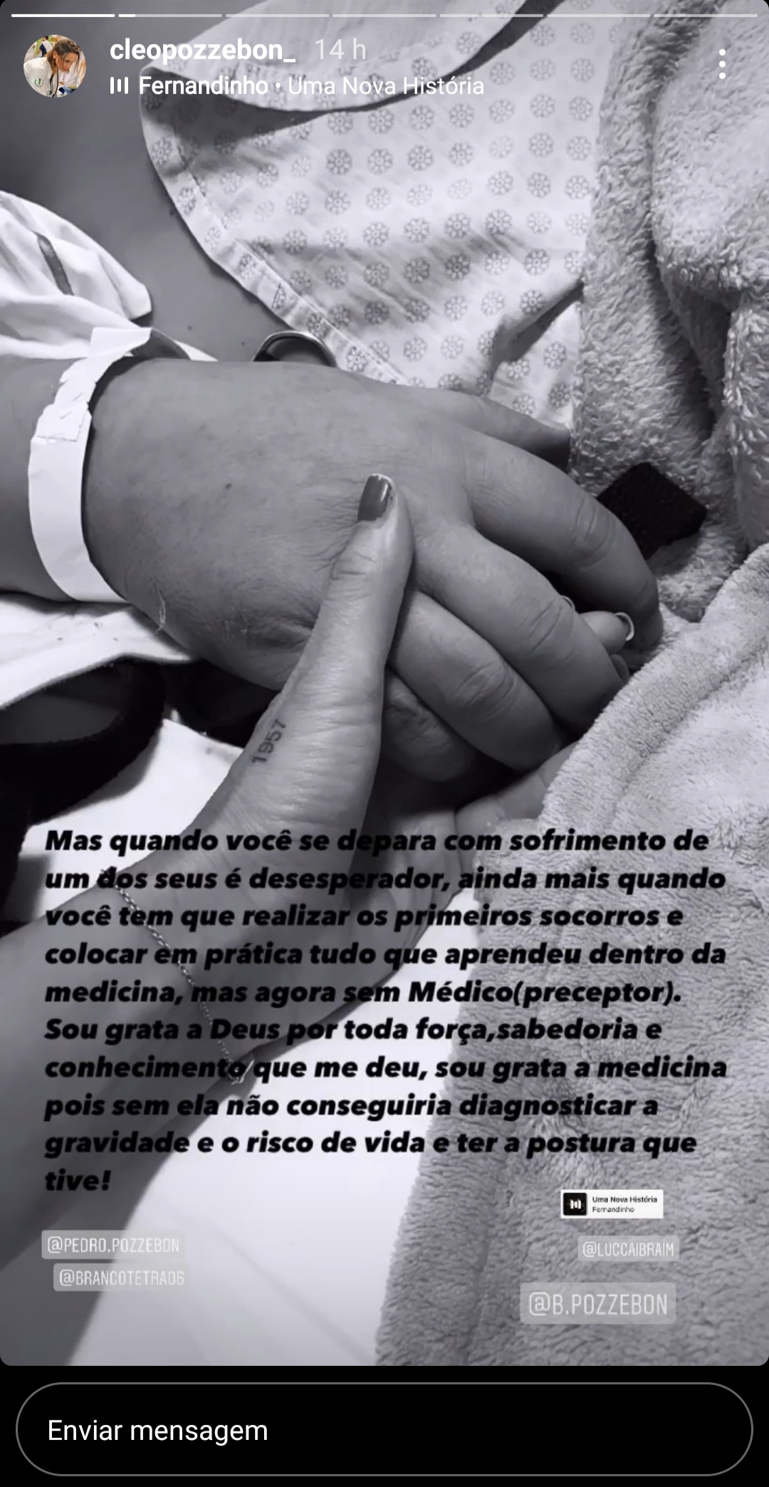 A mulher, estudante de medicina, colocou uma emotiva mensagem nas redes sociais. Aliás, Cléo Pozzebon agradeceu mesmo à medicina, pois segundo ela, sem esses conhecimentos, teria sido impossivel prestar os primeiros socorros a Branco.