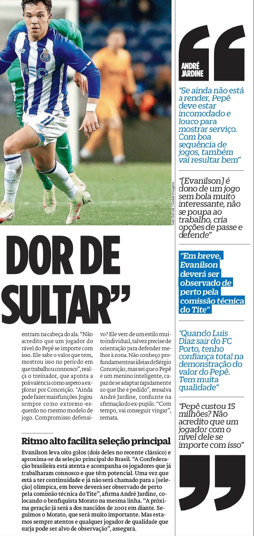 Na sequência do bis ao Benfica no 1° dos dois clássicos, o jornal OJOGO entrevistou André Jardine, selecionador olímpico do Brasil que deixou uma garantia em jeito de revelação: Evanilson está a ser observado para a seleção principal e pode estar mesmo às portas da canarinha. Tite está atento.