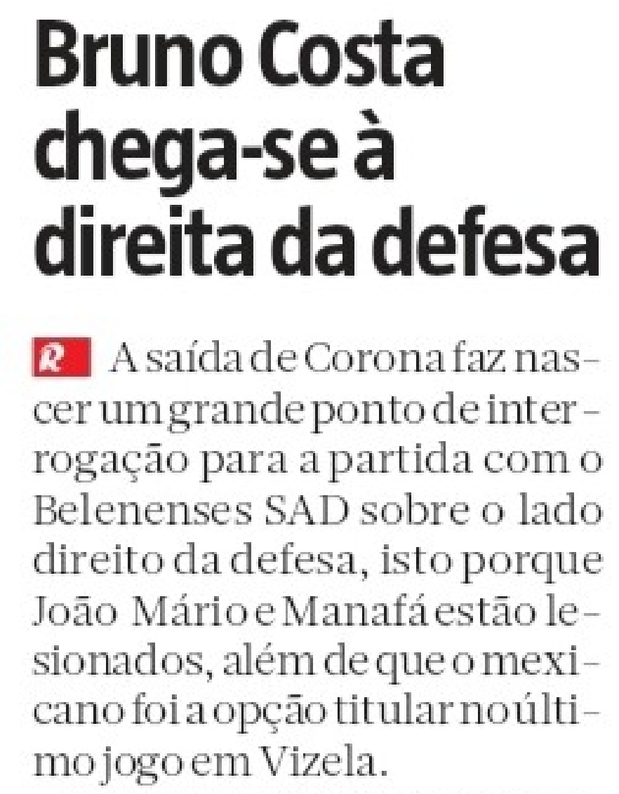 Fora de brincadeiras, e sem falsas modéstias, ontem lancei a hipótese de Bruno Costa ser opção (forte) a considerar pelo lado direito da defesa, não só pelo jogo de Vizela, mas sobretudo pelo seu passado na formação, e hoje o Record refere isso mesmo: Bruno Costa é, neste momento – mesmo com a chamada de Rodrigo Pinheiro, acrescento eu – a hipótese mais forte para assumir a defesa da equipa.