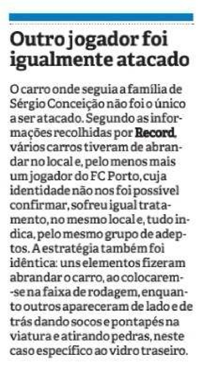 Num destes casos, terá sido parado um carro de um jogador e o mesmo sido atingidos com pontapés e pedras no vidro traseiro.