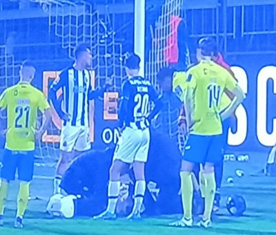 Enorme susto no Arouca-FC Porto. Diogo Costa caiu desamparado após uma disputa aérea com o gigante Abdoulaye e esteve vários minutos no relv