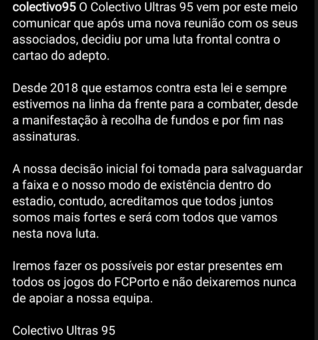 Os Colectivo Ultras 95, claque do FC Porto, aliaram-se à outra claque do FC Porto, no protesto contra o uso do Cartão do adepto.