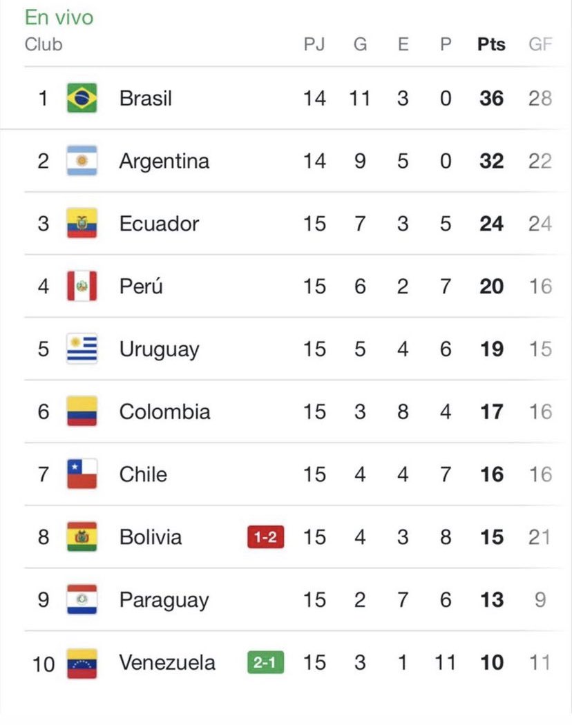Com este resultado, a Colômbia está em muitos maus lençóis e corre (sérios) riscos de não ir ao Mundial do Catar. Está agora em 6° lugar (fora do apuramento direto e do play-off), com menos 2 pontos que o Uruguai e 3 que o Peru, que consegue um resultado Excelente.