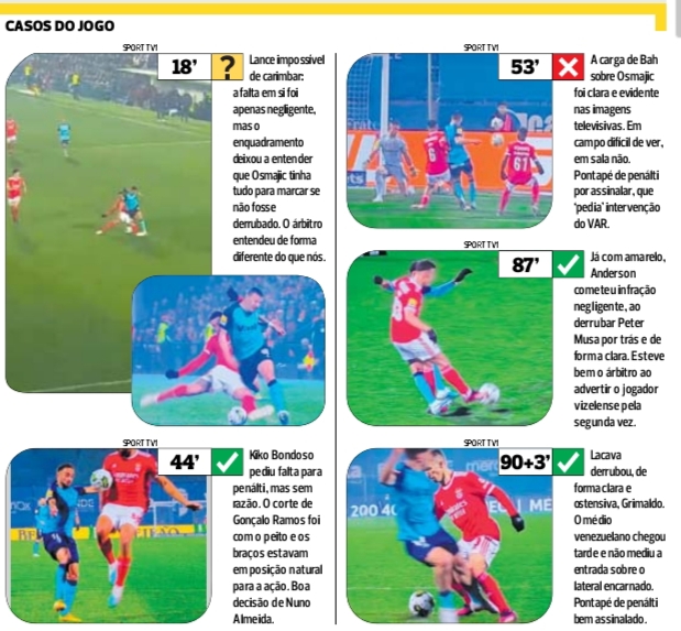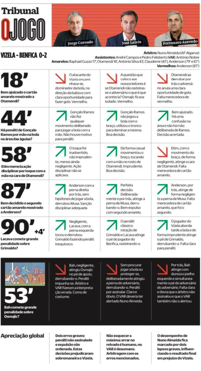 O Benfica foi amplamente beneficiado no jogo diante do Vizela, em Vizela, segundo os especialistas em arbitragem do tribunal OJOGO (e não só, pois ABOLA e RECORD disseram o mesmo num dos lances).