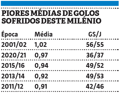 O FC Porto tem uma média de quase 1 golo sofrida por jogo, o que só encontra registo paralelo – ligeiramente pior – em 2001/2002, ano confuso, em que Mourinho substituiu Otávio Machado. A pior média dos últimos 30 anos foi em 97/98, com 1,23 golos sofridos por jogo (59 sofridos em 48 partidas), mas aí marcamos 111 golos conquistamos a dobradinha sob a batuta de António Oliveira, algo que já é impossível este ano. Vê abaixo as piores médias de golos sofridos neste milénio.