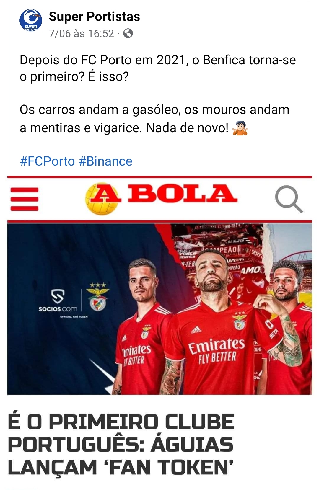 O Benfica estreou se nos fan token e ABOLA escreveu, ERRADAMENTE, que era pioneira em Portugal.