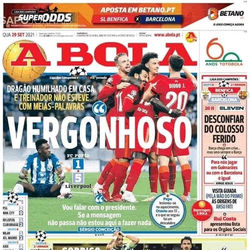Não contente com tudo isto, ABOLA ainda teve a lata de colocar esta capa, quando, na presente época, colocou outra completamente distinta, quando perdemos 1-5 com o Liverpool (aos 75′ estava 1-3, e num jogo onde estávamos privados de Mbemba, Pepe lesionou-se no aquecimento e Otávio logo no início do jogo. Ah, e em que fizemos uma exibição muito má).