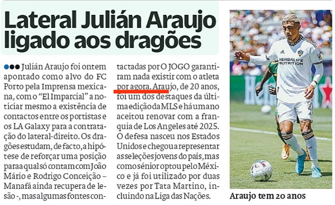 O jornal OJOGO desmente hoje o propalado interesse no dia de ontem do FC Porto no lateral direito internacional mexicano Julian Araújo.