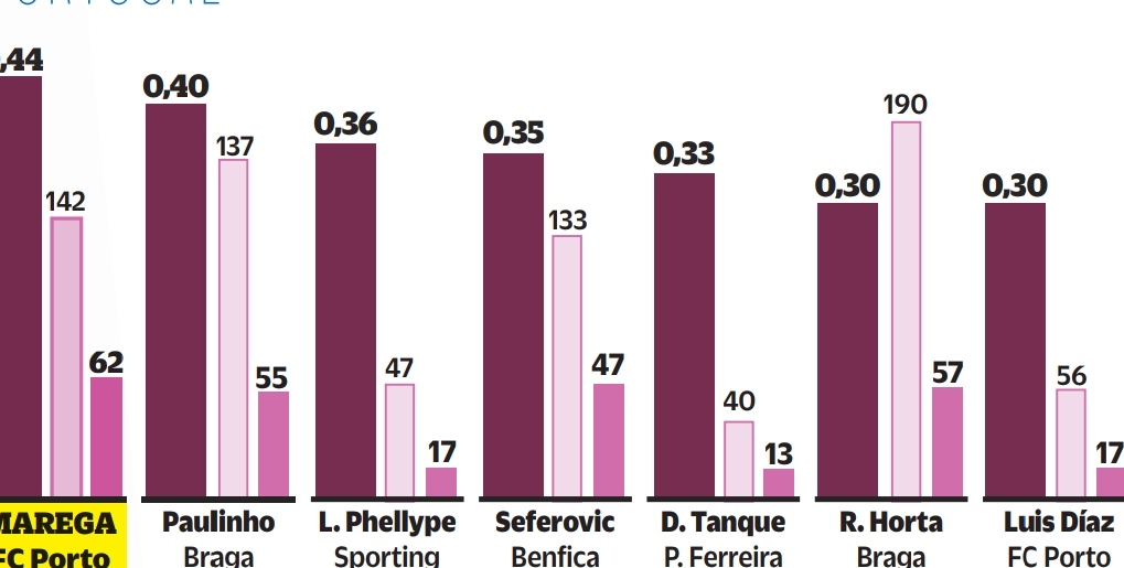Marega tem a melhor média de golos entre todos os avançados em Portugal.Os dados só são extraídos aos avançados que completaram pelo menos uma época ao serviço do clube.