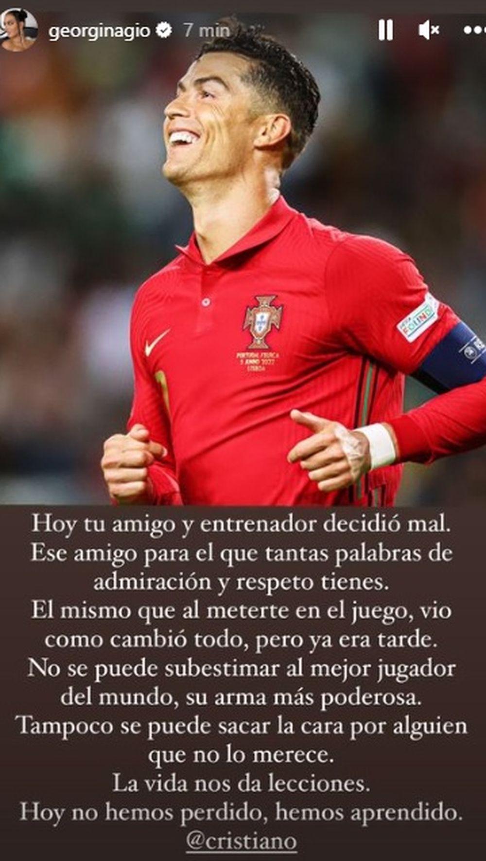 Hoje, o teu amigo e treinador decidiu mal. Esse amigo para quem tens tantas palavras de admiração e tanto respeito. O mesmo amigo que, ao meter-te em campo, viu como tudo mudou, mas já era tarde. Não se pode subestimar o melhor jogador do mundo e a arma mais poderosa que tens, como não podes dar a cara por alguém que não o merece. A vida dá-nos lições, hoje não perdemos, hoje aprendemos”.