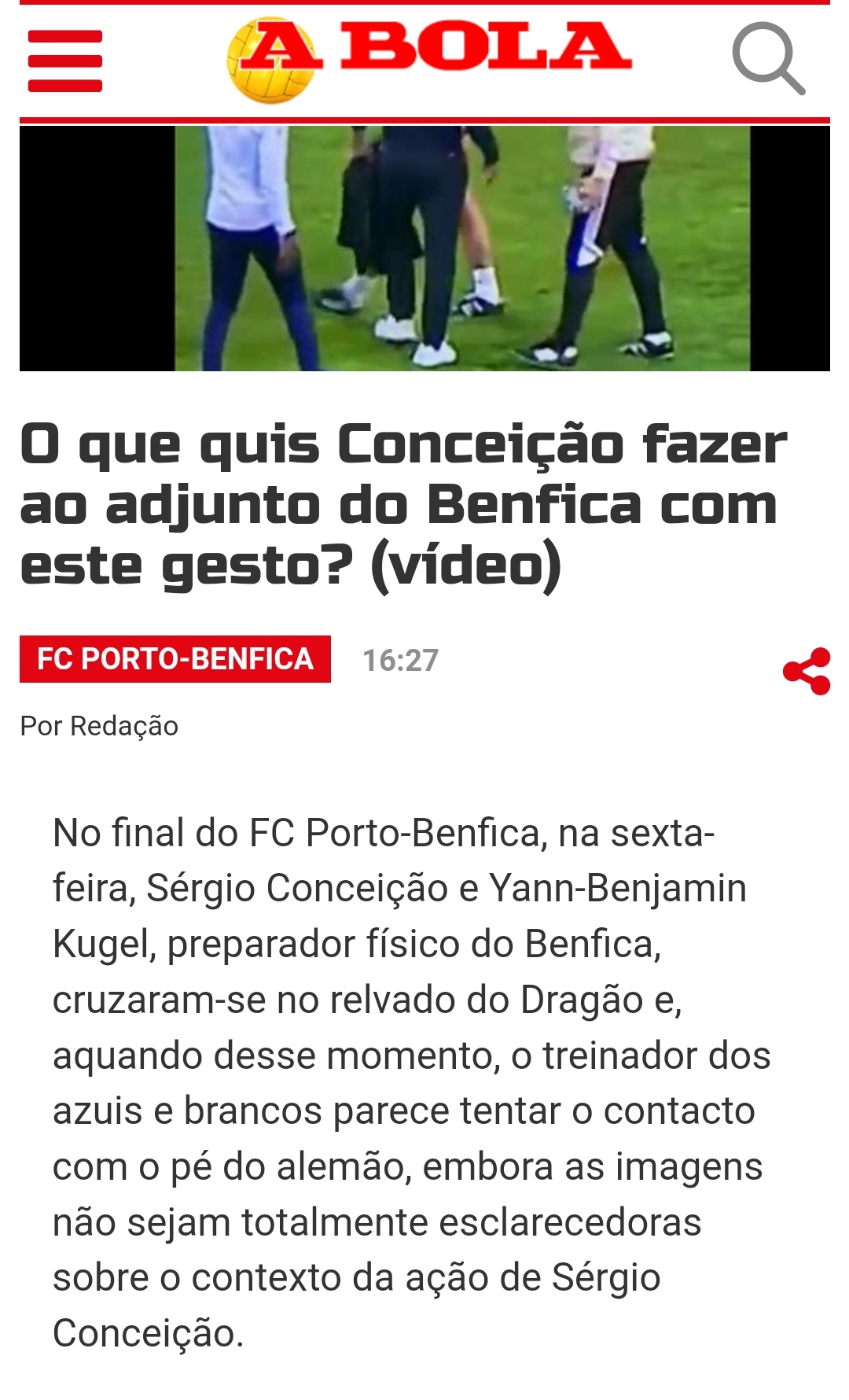 O jornal ABOLA acaba de lançar uma especulação patética e ridicula para dar a entender que Sérgio Conceição teria tentado rasteirar um dos elementos da equipa técnica do Benfica.