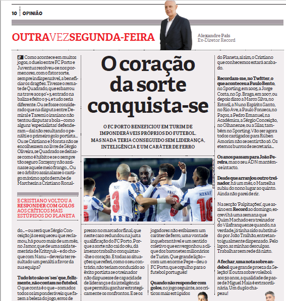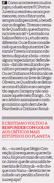 Em abono da verdade devo dizer que, a muito custo, Alexandre Pais lá elogia os méritos do FC Porto, mas alguém que se “esquece” da bola à barra de Uribe, do possível penalty de Cuadrado (aliás, quem escreve “Quadrado” nota-se que percebe de futebol como eu de tricot), do falhanço de Sérgio Oliveira no Dragão e do “cheiro de bola” à Vecchia Signora, da má receção de Marega quando se ia isolar, da expulsão exagerada de Mehdi, nas expulsões perdoadas a Rabiot, Chiesa, Alex Sandro, Bernardeschi e a este mesmo Cuadrado etc etc) é de alguém de má fé e por isso não merece mais nenhum comentário.