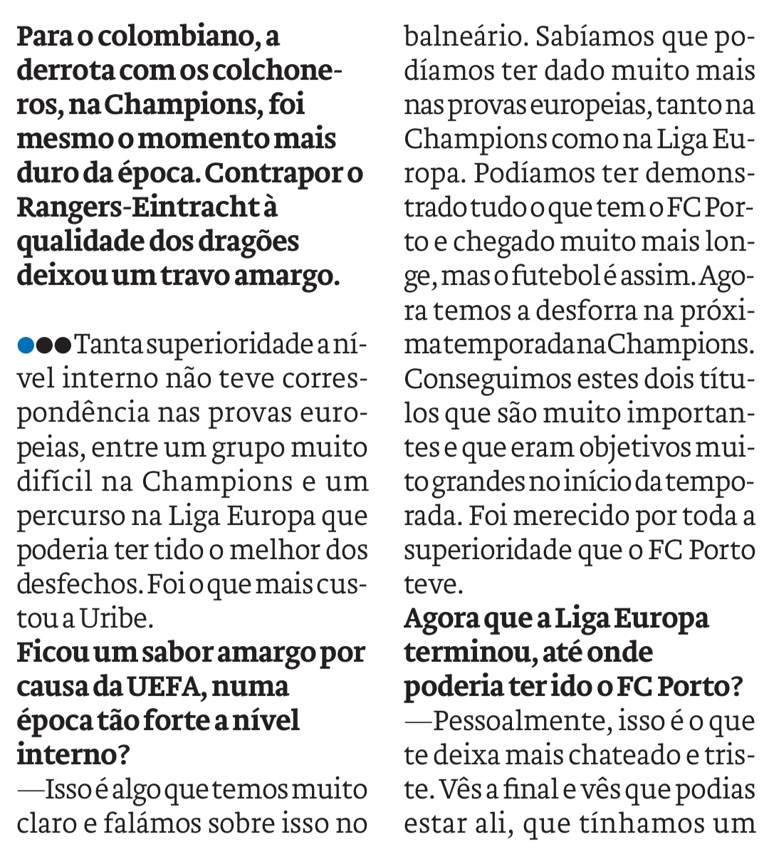 Uribe passou em revista a época do FC Porto e deixou um grande lamento: a fraca participação nas competições europeias, principalmente na Liga Europa, onde o médio colombiano acredita que o FC Porto podia ter chegado à final.