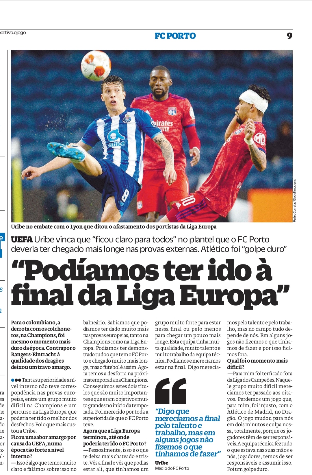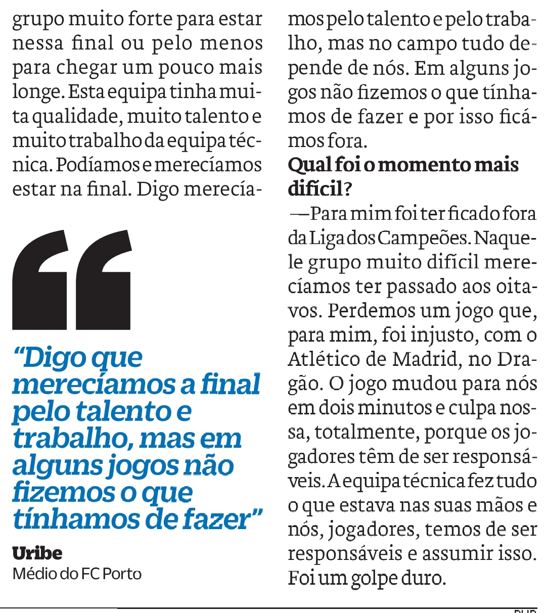 Uribe passou em revista a época do FC Porto e deixou um grande lamento: a fraca participação nas competições europeias, principalmente na Liga Europa, onde o médio colombiano acredita que o FC Porto podia ter chegado à final.